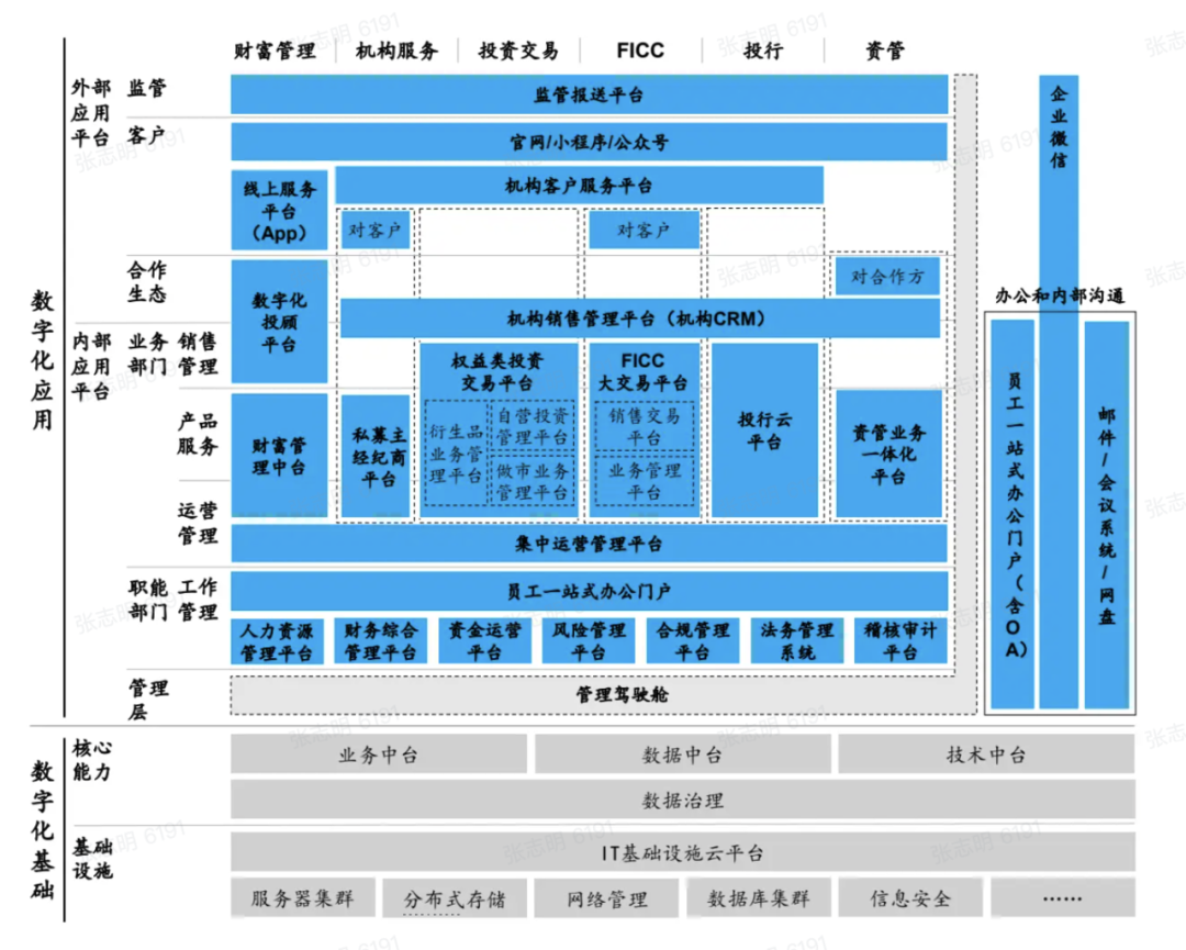 上面这张图,来自于麦肯锡的《券商数字化转型》报告。图的最底层,是关于技术的,如云平台,数据中台等。上部则是各种数字化的应用,又按照组织内外分成了两块。其中组织内部,按照后台,中台,前台进行了切分。